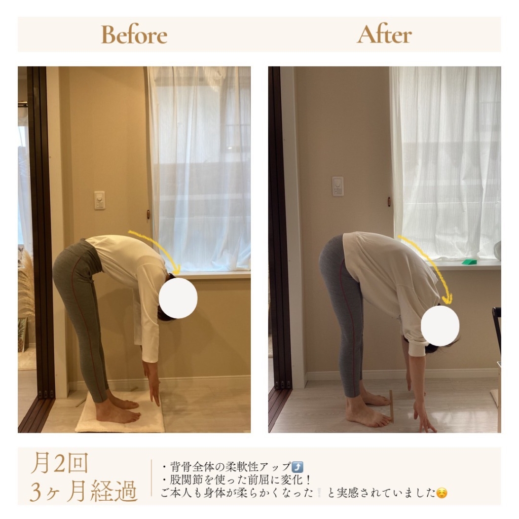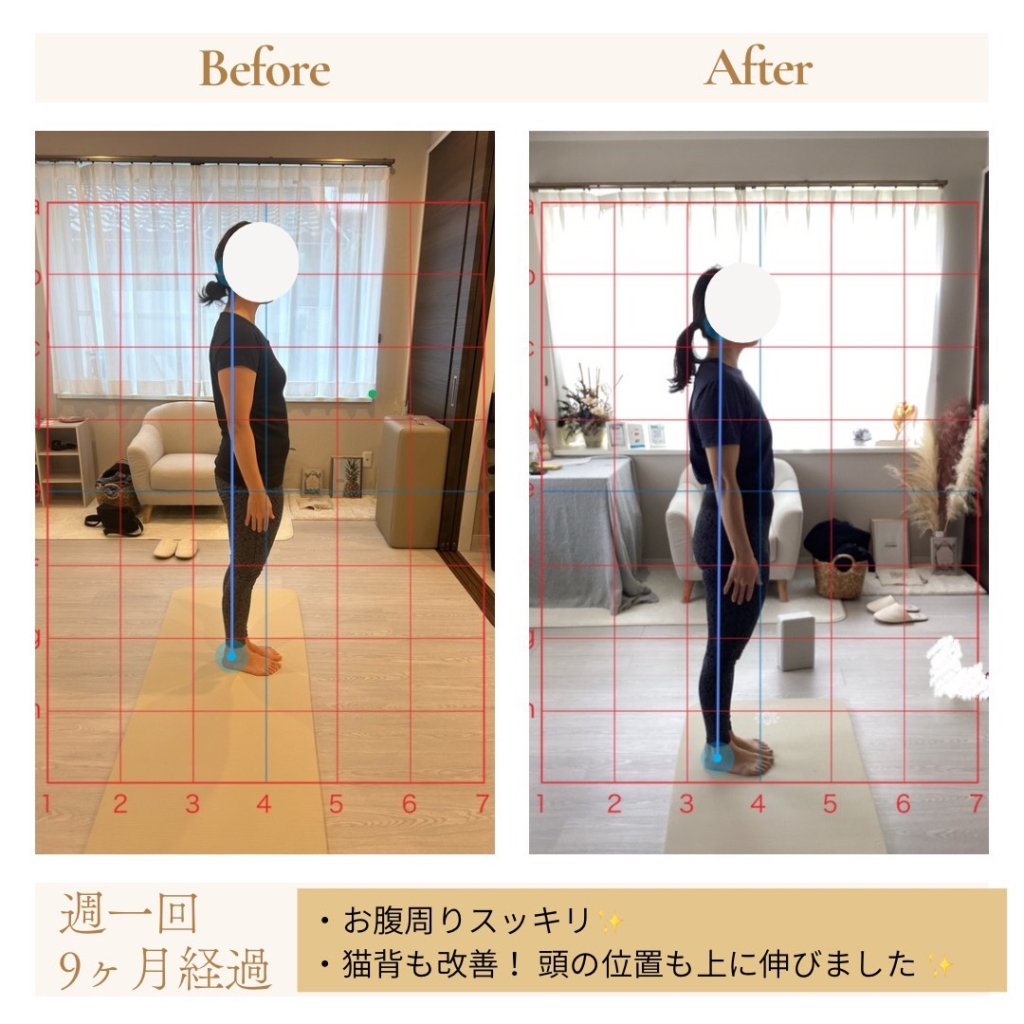 周りからも「立ち姿がきれいになったね」と声をかけられることも増えました。毎回のピラティスがとても楽しみで、欠かせないものになりました‼